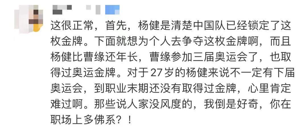 然而,比赛结束后,极个别网友对杨健赛后失落离场和拿错冠军花束一事提出质疑,认为其没有第一时间向队友表示祝贺的行为“不够大气”。8月9日,杨健在微博发布长文表示,“回顾男子单人十米台决赛,在最后看到自己冠军无望时,那种心酸那种痛苦真的无法用言语形容,说实话那时候我真的笑不出来,我只能欲哭无泪表情摇着头否定自己,痛苦自责。”