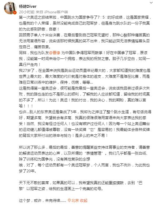 杨健称,自己已经27岁,属于跳台运动员里年纪最大的,难度也是世界上最大的。这是他的第一届奥运会,很可能也是最后一届奥运会。“我没有怪过任何人!也没有嫉妒过任何人!因为每一个站上奥运舞台的运动健儿都值得被尊敬, 没有一块奖牌‘它‘是容易的!我最能体会各种奖牌的背后大家所付出的艰辛与努力!是多么的来之不易!”