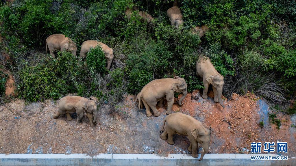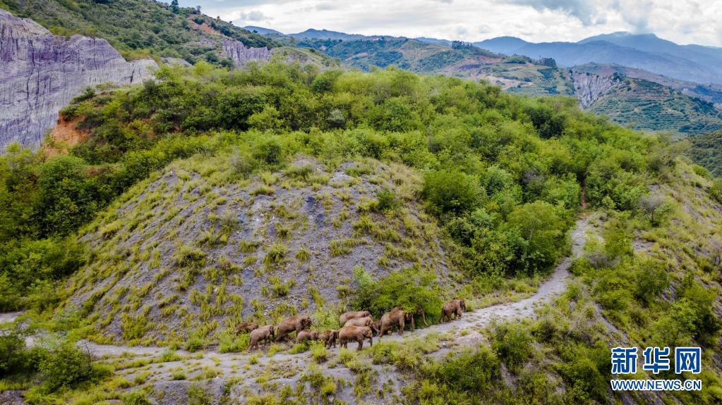 这是5月28日在云南省玉溪市峨山县境内拍摄的象群(无人机照片)。新华社记者 胡超 摄