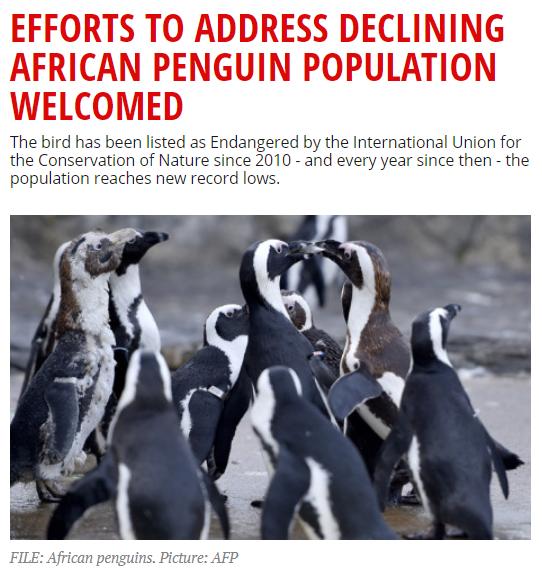 南非林业、渔业和环境部称将会召开协调会议,商讨如何为非洲企鹅提供安全的生活环境,又不对该国渔业造成过于严重的影响。为利于非洲企鹅的生存和繁衍,目前初步决定减少在该国六个主要的企鹅栖息地及周围的渔业捕捞。