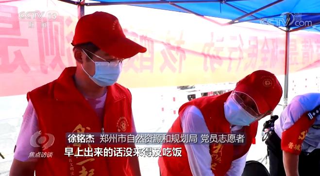 郑州市自然资源和规划局党员志愿者徐铭杰说:“他早上出来时没来得及吃饭,因为要往这送饭,想着大家先吃,这么着就中暑了,低血糖,他还没有休息过,没有回过家。”
