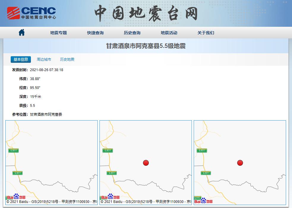 央视网消息:据中国地震台网正式测定,8月26日7时38分在甘肃酒泉市阿克塞县发生5.5级地震,震源深度15千米,震中位于北纬38.88度,东经95.50度。