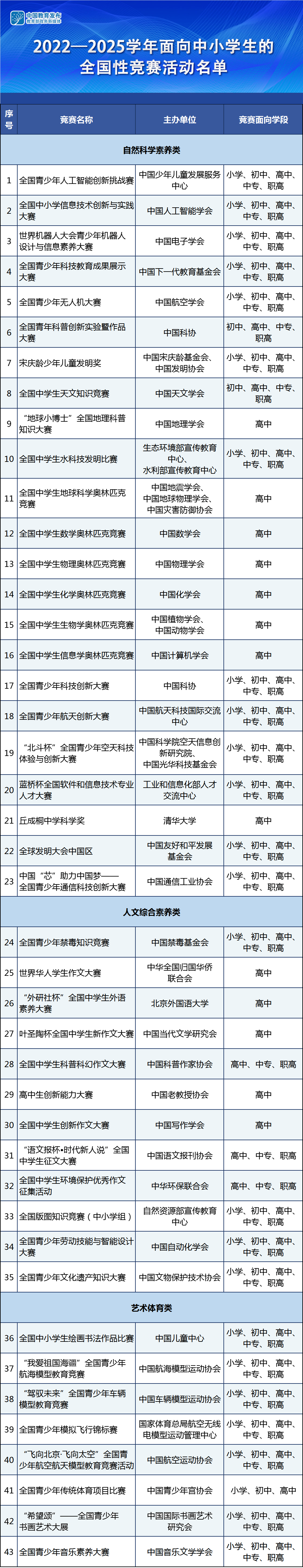 教育部办公厅最新公示了《2022-2025学年面向中小学生的全国性竞赛活动名单》,目标强基综评等特殊招生的考生家长可从以下名单中选择适合自己的竞赛进行发展: