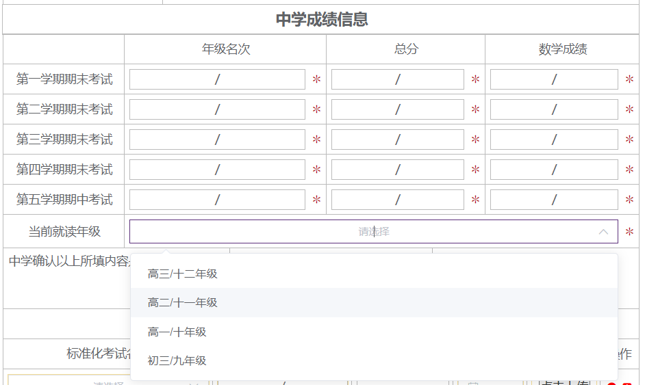 1. 高中生须填写高中期间成绩信息,初中生须填写初中期间成绩信息。